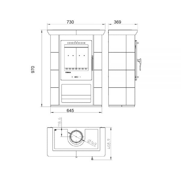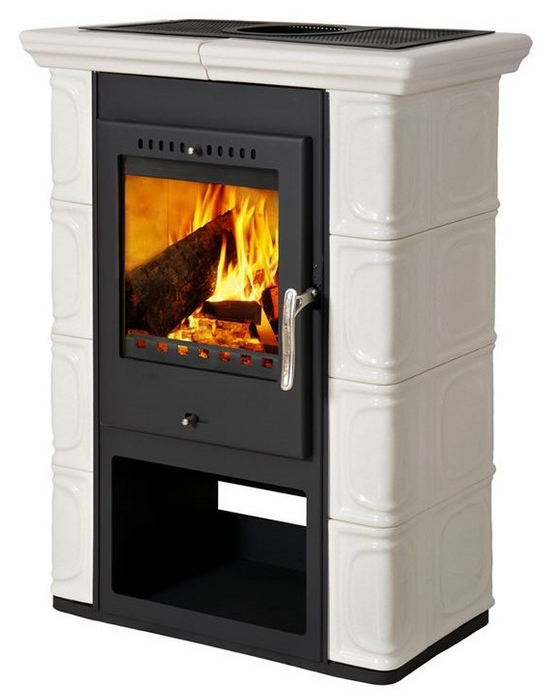 Wnętrze wyłożone szamotem dla zapewnienia skutecznego i czystego spalania drewna. Wykonany z blachy pomalowanej proszkowo na czarno i ozdobiony klasycznymi ceramicznymi kaflami w kolorze kremowym. W górnej części stalowa krata zwiększający przepływ gorącego powietrza. Idealnie odnajdzie się w stylowych pomieszczeń urządzonych w klimacie retro.