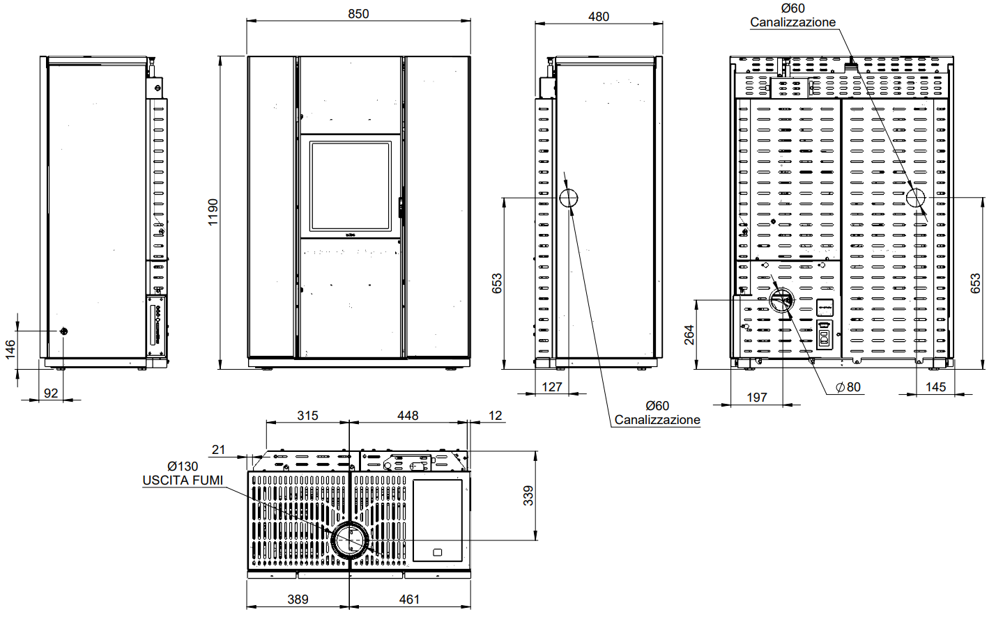- Odprowadzenie spalin ø 130 mm: górne