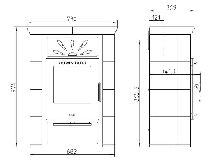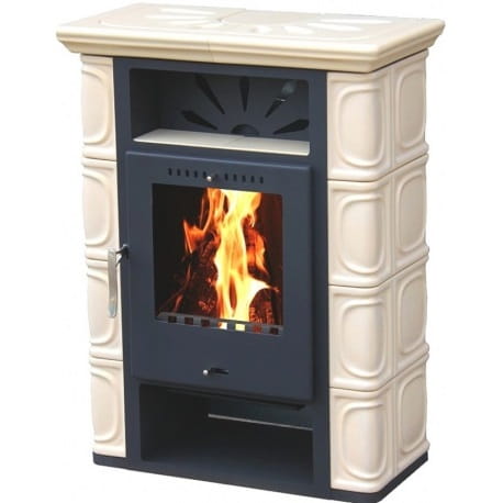 Wnętrze wyłożone szamotem dla zapewnienia skutecznego i czystego spalania drewna. Wykonany z blachy pomalowanej proszkowo na czarno i ozdobiony klasycznymi ceramicznymi kaflami w kolorze kremowym. Idealnie odnajdzie się w stylowych pomieszczeń urządzonych w klimacie retro.