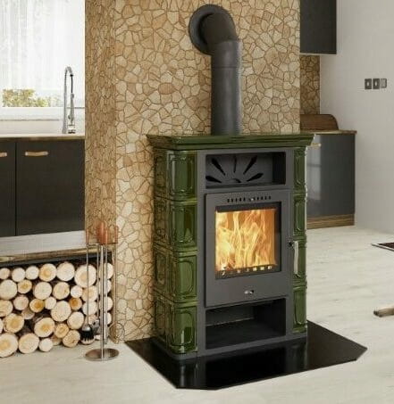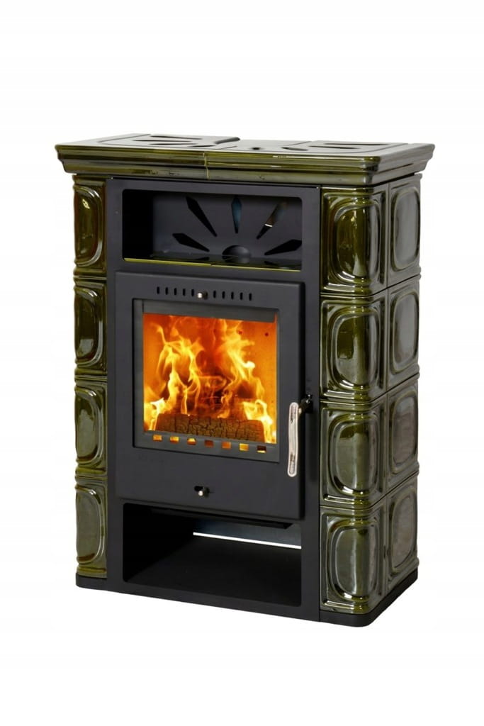 Wnętrze wyłożone szamotem dla zapewnienia skutecznego i czystego spalania drewna. Wykonany z blachy pomalowanej proszkowo na czarno i ozdobiony klasycznymi ceramicznymi kaflami w kolorze butelkowej zieleni. Idealnie odnajdzie się w stylowych pomieszczeń urządzonych w klimacie retro.