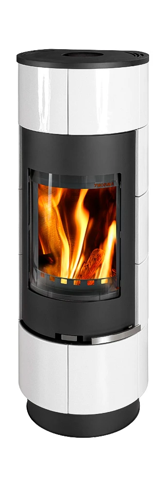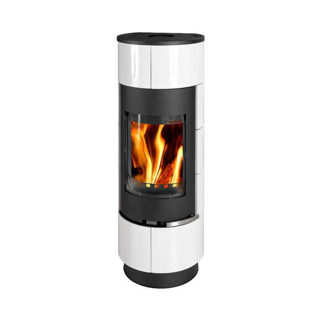 Wnętrze wyłożone wermikulitem dla zapewnienia skutecznego i czystego spalania drewna. Wykonany z blachy pomalowanej proszkowo na kolor czarny oraz pięknych białych kafli. Idealnie wpasowuje się w nowoczesne i minimalistyczne wnętrza. Zintegrowany panel konwekcyjny umożliwia umiejscowienie pieca w bliskiej odległości od ściany.