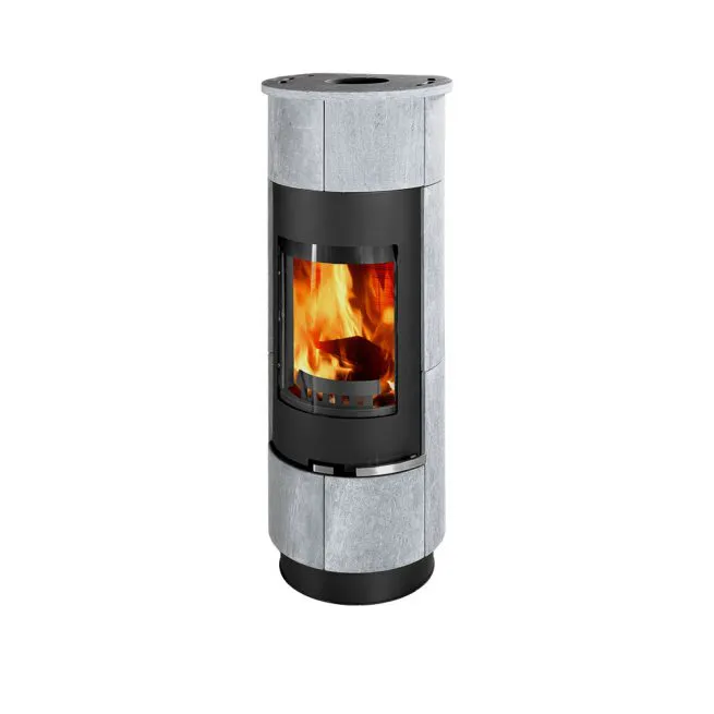 Wnętrze wyłożone wermikulitem dla zapewnienia skutecznego i czystego spalania drewna. Wykonany z blachy pomalowanej proszkowo na kolor czarny i ozdobiony kamieniem Serpentino. Ten materiał akumuluje ciepło dłużej niż kafel ceramiczny. Idealnie wpasowuje się w nowoczesne i minimalistyczne wnętrza. Zintegrowany panel konwekcyjny umożliwia umiejscowienie pieca w bliskiej odległości od ściany.